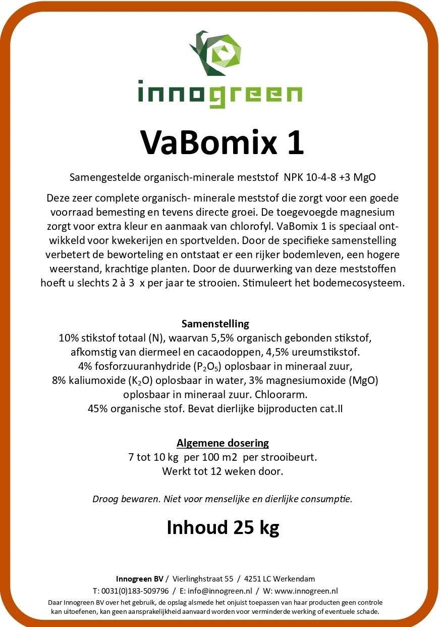 Vabomix1 is een allround meststof zonder bijzondere toevoegingen. Het is een breed inzetbare meststof die onder andere kan worden toegepast op sportvelden.